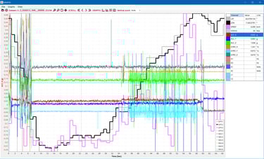The Analysis suite provides high-performance visualization using dynamic TeeChart graphs designed for professional inspection. Navigate your recordings with millisecond precision using interactive cursors and real-time data grids that update instantly as you move. Beyond standard time-based charts, DataStudio includes a professional toolkit for deep analysis: Statistics (Min, Max, Avg, StdDev), XY Scatter plots for correlation studies, Histograms for frequency distribution, and FFT (Fast Fourier Transform) for advanced vibration and spectrum analysis.