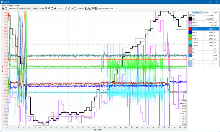 The Logger module serves as the software's central hub for defining acquisition logic and device behavior. Users can activate and fine-tune all 38 simultaneous inputs, including the integrated 10Hz GPS and 6-axis IMU. The interface offers granular control over sampling rates (up to 200Hz), industrial CAN Bus protocols (such as OBD II, J1939, and ISOBUS), and programmable Auto-Start triggers.