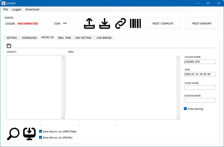 Managing your recordings is fast, flexible, and organized into intuitive datasets. The software supports standard USB-C downloads for quick access to recorded sessions directly from the device. For massive high-frequency recordings, the dedicated Micro SD function allows for "low-level raw reading". By connecting the SD card directly to your PC, you can extract gigabytes of data in seconds, bypassing serial communication limits and ensuring maximum efficiency.